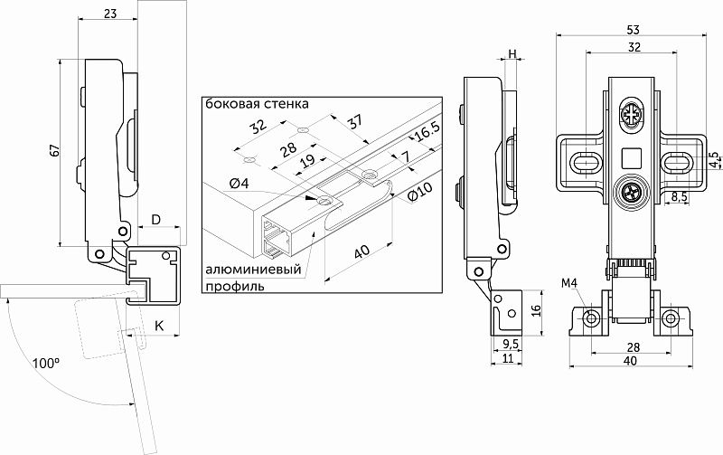 Петля накладная для алюминиевого профиля Z1 с доводчиком c планкой h0 системой clip-on с саморезами в комплекте. Высота ответной планки H=0 мм.Технические характеристики: