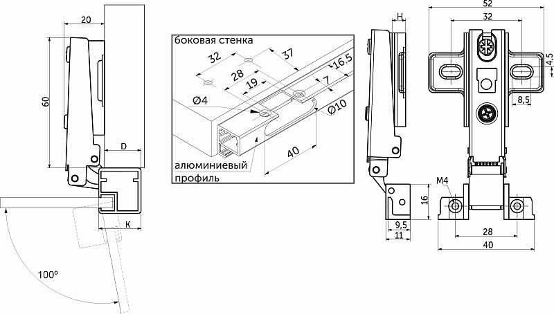 Петля д/алюм.рамки Z-1 накладная с пружиной h2 slide-on, саморезы, AKS 123237, технические характеристики: