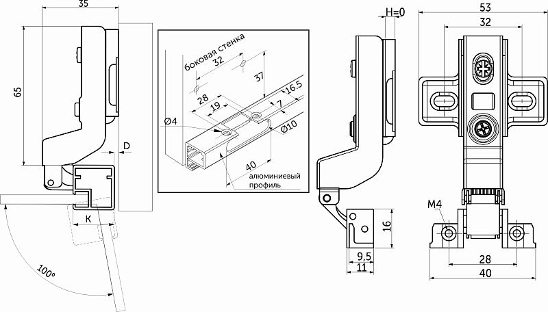 Петля накладная для алюминиевого профиля Z1 с доводчиком c планкой h0 системой clip-on с саморезами в комплекте. Высота ответной планки H=0 мм.Технические характеристики: