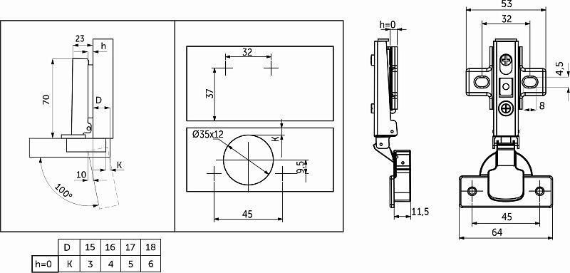 Петля накладнаясдоводчикомGRIDLI– мебельнаяПетля с механизмом плавного закрывания фасада, с углом установки 90°. Изготовлена из холоднокатанной стали. Диаметр чашки петли составляет ∅35 мм. Глубина чашки 11,5 мм. Глубина сверления, необходимая для установки, 12 мм. Для простоты монтажа и регулировки даннаяПетля оснащена механизмом быстрого монтажаclip-on. Регулировка по глубине - винтовая.Петля предназначена для фасадов толщиной от 15 до 22 мм, имеет межцентровое расстояние между отверстиями в чашке в 45мм, а также высоту монтажной планки h0. Петли данной линейки являются двухходовыми, с возможностью остановки фасада в полуоткрытом положении, имеют угол открывания в 100°. Вес петли 87±1гр.Технические характеристики: