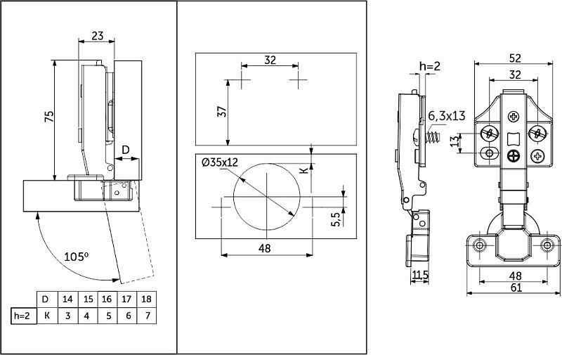 Петля накладная c доводчиком PRIME by AKS 3D — это сочетание надежности, функциональности и эстетики. Созданы в соответствии с международными стандартами для производителей качественной мебели сегмента «средний+». Изготовлены из высококачественной холоднокатанной стали, имеют никелевое покрытие и усиленную пружину, что обеспечивает их надёжность и долговечность. Эти петли идеально подходят для создания стильной и долговечной мебели, отвечающей международным стандартам, а также гарантируют бесперебойную работу механизма на протяжении 100 000 циклов открывания/закрывания, что подтверждается проверкой в собственной испытательной лаборатории. Особая конструкция механизма доводчика гарантирует бесшумное закрытие фасадов, срабатывая при его открытии на угол от 5°. Петли PRIME by AKS имеют эксцентриковую регулировку по глубине, систему двухпозиционного отрывания TWO-WAY, а также прочную систему быстрого монтажа и демонтажа ответной планки CLIP-ON. ДаннаяПетля подходит для фасадов толщиной до 22мм, имеет межцентровое расстояние между отверстиями в чашке в 48мм, а также высоту монтажной планки h2.Петля PRIME by AKS имеет двухслойное гальваническое покрытие (с медным подслоем), что обеспечивает надежную защиту от коррозии. Протестирована в солевом тумане более чем 48 часов без каких-либо коррозионных изменений. Вся линейка петель имеет индивидуальную упаковку по 2 шт. В комплект входят:Петля, монтажная планка, декоративные заглушки чашки и плеча петли, а также саморезы 4*16мм. Наличие широкого диапазона регулировки по горизонтали, глубине и вертикали в ±2мм, позволит минимизировать все неточности монтажа.Петля с доводчиком PRIME by AKS может быть установлена со специальным ограничителем угла открывания до 86° (код 116236). Это поможет избежать столкновений фасада со стеной или с соседними модулями. Внимание: для корректного выставления необходимых зазоров обратите внимание на таблицы наложений фасада на корпус ящика!Технические характеристики: