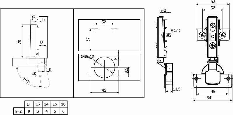 Петля накладная с доводчиком AKS с еврошурупами – классическая мебельнаяПетля с механизмом плавного закрывания фасада, с углом установки 90°. Изготовлена из холоднокатанной стали. Диаметр чашки петли составляет ∅35 мм. Глубина чашки 11,5 мм. Глубина сверления, необходимая для установки, 12 мм. Для простоты монтажа и регулировки даннаяПетля оснащена механизмом быстрого монтажа clip-on. Регулировка по глубине - винтовая.Петля предназначена для фасадов толщиной от 15 до 22 мм, имеет межцентровое расстояние между отверстиями в чашке в 48мм, а также высоту монтажной планки h2. Петли данной линейки являются двухходовыми, с возможностью остановки фасада в полуоткрытом положении, имеют угол открывания в 100°. Для монтажа планки в комплект входят предустановленные еврошурупы 6,3*13мм. Вес петли 91±1гр. Прочность, долговечность и надежность в использовании подтверждается 40 000 циклами открывания и закрывания.Технические характеристики:
