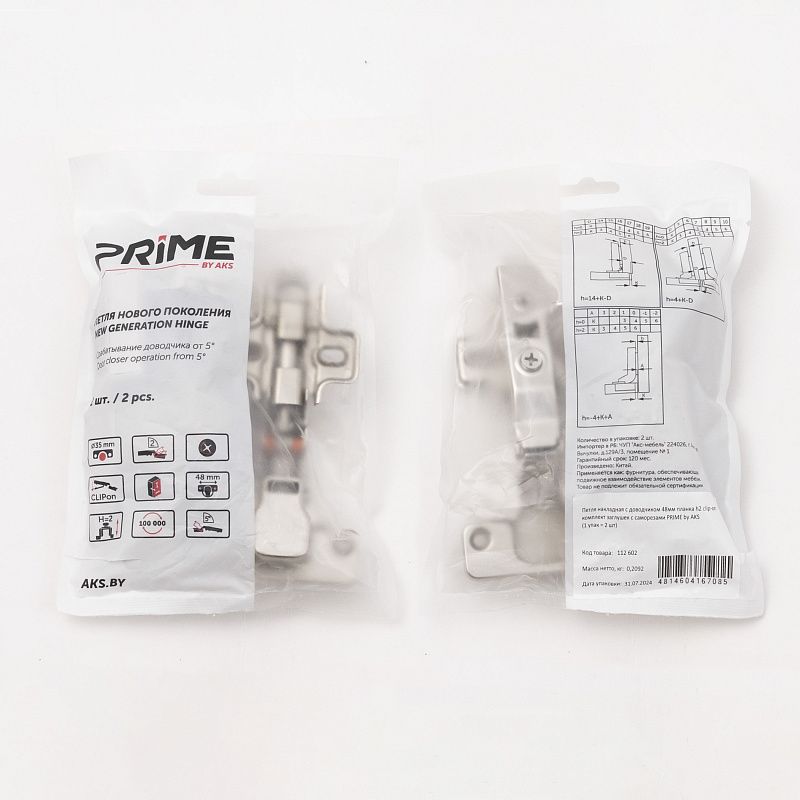 Петля накладная с доводчиком 48мм h2 clip-on, саморезы, заглушки, упак. = 2 шт., PRIME by AKS 112602, описание: