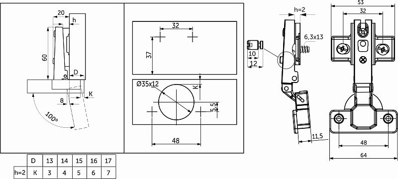 Петля накладная с пружиной AKS с еврошурупами – классическая мебельнаяПетля без доводчика, с углом установки 90°. Изготовлена из холоднокатанной стали. Диаметр чашки петли составляет ∅35 мм. Глубина чашки 11,5 мм. Глубина сверления, необходимая для установки, 12 мм. Для простоты монтажа и регулировки даннаяПетля оснащена механизмом надвижного монтажа slide-on и регулировочным винтом с резьбой 10 мм. Регулировка по глубине -винтовая.Петля предназначена для фасадов толщиной от 15 до 22 мм, имеет межцентровое расстояние между отверстиями в чашке в 45мм, а также высоту монтажной планки h0. Петли данной линейки являются двухходовыми, с возможностью остановки фасада в полуоткрытом положении, имеют угол открывания в 100°. Для монтажа планки в комплект входят предустановленные еврошурупы 6,3*13мм. Вес петли 55±1гр. Прочность, долговечность и надежность в использовании подтверждается 40 000 циклами открывания и закрывания.Технические характеристики: