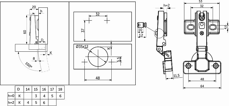 Петля накладная с пружиной AKS с еврошурупами – классическая мебельнаяПетля без доводчика, с углом установки 90°. Изготовлена из холоднокатанной стали. Диаметр чашки петли составляет ∅35 мм. Глубина чашки 11,5 мм. Глубина сверления, необходимая для установки, 12 мм. Для простоты монтажа и регулировки даннаяПетля оснащена механизмом надвижного монтажа slide-on и регулировочным винтом с резьбой 10 мм. Регулировка по глубине -винтовая.Петля предназначена для фасадов толщиной от 15 до 22 мм, имеет межцентровое расстояние между отверстиями в чашке в 45мм, а также высоту монтажной планки h0. Петли данной линейки являются двухходовыми, с возможностью остановки фасада в полуоткрытом положении, имеют угол открывания в 100°. Для монтажа планки в комплект входят предустановленные еврошурупы 6,3*13мм. Вес петли 55±1гр. Прочность, долговечность и надежность в использовании подтверждается 40 000 циклами открывания и закрывания.Технические характеристики: