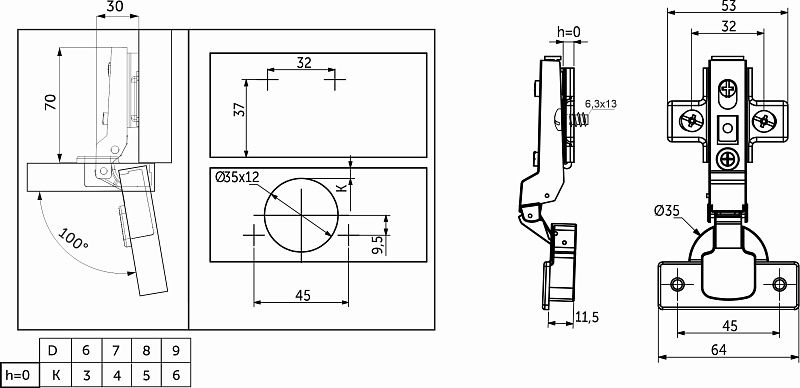 Петля полунакладная с доводчиком AKS с еврошурупами – классическая мебельнаяПетля с механизмом плавного закрывания фасада, с углом установки 90°. Изготовлена из холоднокатанной стали. Диаметр чашки петли составляет ∅35 мм. Глубина чашки 11,5 мм. Глубина сверления, необходимая для установки, 12 мм. Для простоты монтажа и регулировки даннаяПетля оснащена механизмом быстрого монтажа clip-on. Регулировка по глубине - винтовая.Петля предназначена для фасадов толщиной от 15 до 22 мм, имеет межцентровое расстояние между отверстиями в чашке в 45мм, а также высоту монтажной планки h0. Петли данной линейки являются двухходовыми, с возможностью остановки фасада в полуоткрытом положении, имеют угол открывания в 100°. Для монтажа планки в комплект входят предустановленные еврошурупы 6,3*13мм. Вес петли 91±1гр. Прочность, долговечность и надежность в использовании подтверждается 40 000 циклами открывания и закрывания.Технические характеристики:
