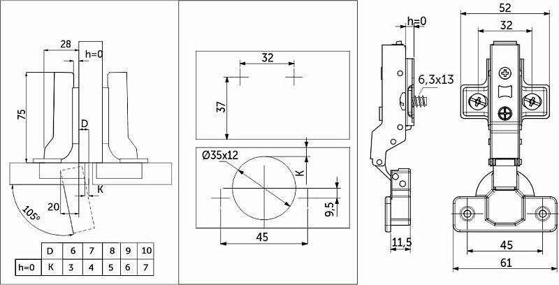 Петля полунакладная с доводчиком 45мм h0 clip-on, еврошурупы, заглушки, упак. = 2 шт., PRIME by AKS 113401, описание: