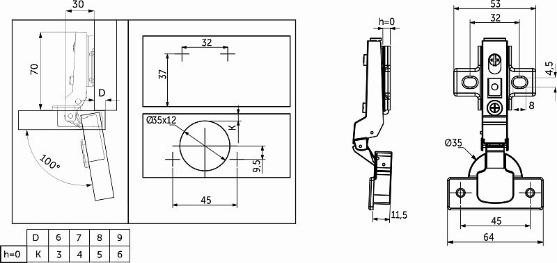 Петля накладнаясдоводчикомAKS– классическая мебельнаяПетля с механизмом плавного закрывания фасада, с углом установки 90°. Изготовлена из холоднокатанной стали. Диаметр чашки петли составляет ∅35 мм. Глубина чашки 11,5 мм. Глубина сверления, необходимая для установки, 12 мм. Для простоты монтажа и регулировки даннаяПетля оснащена механизмом быстрого монтажаclip-on. Регулировка по глубине - винтовая.Петля предназначена для фасадов толщиной от 15 до 22 мм, имеет межцентровое расстояние между отверстиями в чашке в 45мм, а также высоту монтажной планки h0. Петли данной линейки являются двухходовыми, с возможностью остановки фасада в полуоткрытом положении, имеют угол открывания в 100°. Вес петли 91±1гр. В комплект входит:петля - 1 шт, монтажная планка h0 - 1 шт, саморез 4*16мм - 4 шт, заглушки чашки и плеча петли. Прочность, долговечность и надежность в использовании подтверждается40 000 цикламиоткрывания и закрывания.Технические характеристики:
