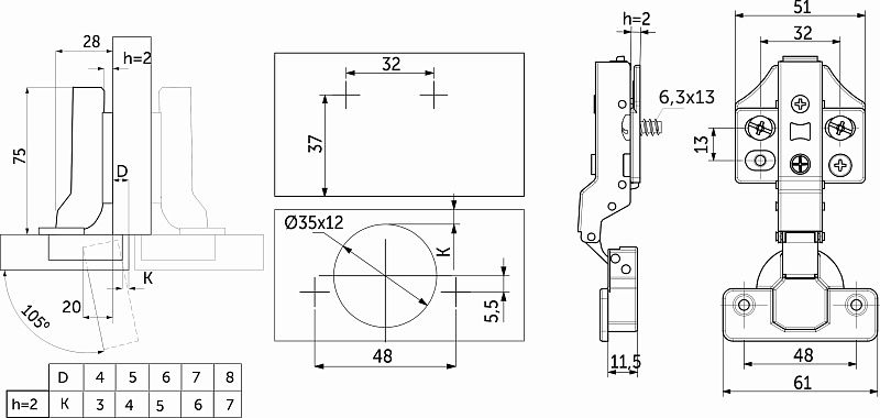 Петля накладная c доводчиком PRIME by AKS 3D — это сочетание надежности, функциональности и эстетики. Созданы в соответствии с международными стандартами для производителей качественной мебели сегмента «средний+». Изготовлены из высококачественной холоднокатанной стали, имеют никелевое покрытие и усиленную пружину, что обеспечивает их надёжность и долговечность. Эти петли идеально подходят для создания стильной и долговечной мебели, отвечающей международным стандартам, а также гарантируют бесперебойную работу механизма на протяжении 100 000 циклов открывания/закрывания, что подтверждается проверкой в собственной испытательной лаборатории. Особая конструкция механизма доводчика гарантирует бесшумное закрытие фасадов, срабатывая при его открытии на угол от 5°. Петли PRIME by AKS имеют эксцентриковую регулировку по глубине, систему двухпозиционного отрывания TWO-WAY, а также прочную систему быстрого монтажа и демонтажа ответной планки CLIP-ON. ДаннаяПетля подходит для фасадов толщиной до 22мм, имеет межцентровое расстояние между отверстиями в чашке в 48мм, а также высоту монтажной планки h2.Петля PRIME by AKS имеет двухслойное гальваническое покрытие (с медным подслоем), что обеспечивает надежную защиту от коррозии. Протестирована в солевом тумане более чем 48 часов без каких-либо коррозионных изменений. Вся линейка петель имеет индивидуальную упаковку по 2 шт. В комплект входят:Петля, монтажная планка, декоративные заглушки чашки и плеча петли, а также саморезы 4*16мм. Наличие широкого диапазона регулировки по горизонтали, глубине и вертикали в ±2мм, позволит минимизировать все неточности монтажа.Петля с доводчиком PRIME by AKS может быть установлена со специальным ограничителем угла открывания до 86° (код 116236). Это поможет избежать столкновений фасада со стеной или с соседними модулями. Внимание: для корректного выставления необходимых зазоров обратите внимание на таблицы наложений фасада на корпус ящика!Технические характеристики:
