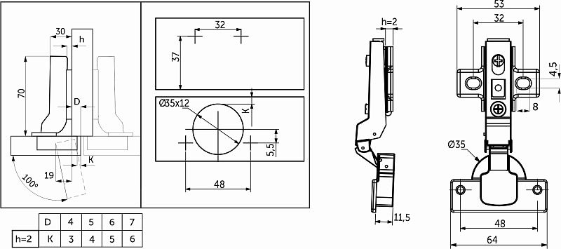 Петля накладная с доводчиком. Межцентровое расстояние 45 мм, высота планки h0.Технические характеристики: