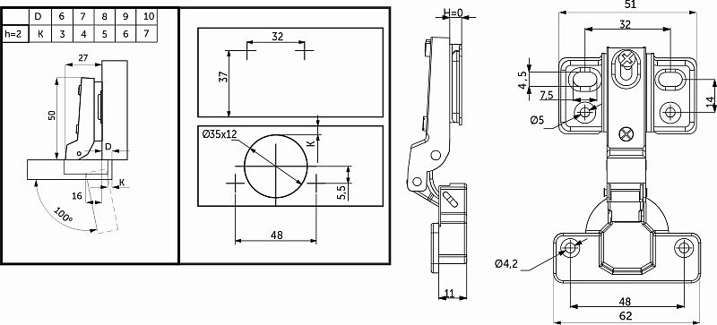 Петля полунакладнаясдоводчикомGRIDLI несъемная планка –мебельнаяПетля с механизмом плавного закрывания фасада, с углом установки 90°. Имеет несъемную планку на 4 отверстия под саморез. Изготовлена из холоднокатанной стали. Диаметр чашки петли составляет ∅35 мм. Глубина чашки 11,5 мм. Глубина сверления, необходимая для установки, 12 мм. Регулировка по глубине - винтовая.Петля предназначена для фасадов толщиной от 15 до 22 мм, имеет межцентровое расстояние между отверстиями в чашке в 48мм, а также высоту монтажной планки h0. ДаннаяПетля является одноходовой, имеет угол открывания в 100°. Вес петли 57±1гр.Технические характеристики: