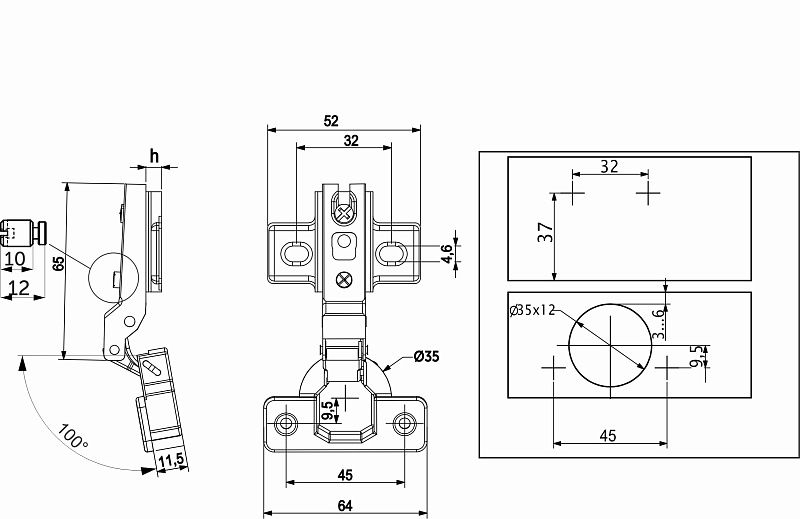 Петля полунакладная с высотой планки H=0 мм и отверстиями в чашке 48мм, фасад прикрепляется к корпусу мебельной конструкции и осуществляется открывание/закрывание дверцы. Диаметр чашки 35 мм. Тип крепления - slide-on . Долговечность - 40 000 циклов при весе фасада 4 кг. Вес- 48 гр.Технические характеристики: