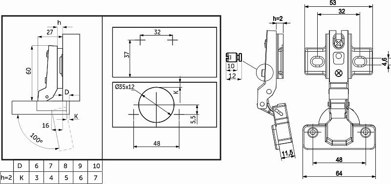 Петля накладная с пружиной GRIDLI – облегченная мебельнаяПетля без доводчика, с углом установки 90°. Изготовлена из холоднокатанной стали. Диаметр чашки петли составляет ∅35 мм. Глубина чашки 11,5 мм. Глубина сверления, необходимая для установки, 12 мм. Для простоты монтажа и регулировки даннаяПетля оснащена механизмом надвижного монтажа slide-on. Регулировка по глубине -винтовая.Петля предназначена для фасадов толщиной от 15 до 22 мм, имеет межцентровое расстояние между отверстиями в чашке в 45мм, а также высоту монтажной планки h0. Петли данной линейки являются двухходовыми, с возможностью остановки фасада в полуоткрытом положении, имеют угол открывания в 100°. Вес петли 52±1гр.Технические характеристики: