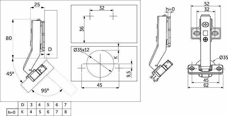 Петля угловая 45° с доводчиком 45мм h0 clip-on, саморезы, заглушки, AKS PLUS 117012, описание:
