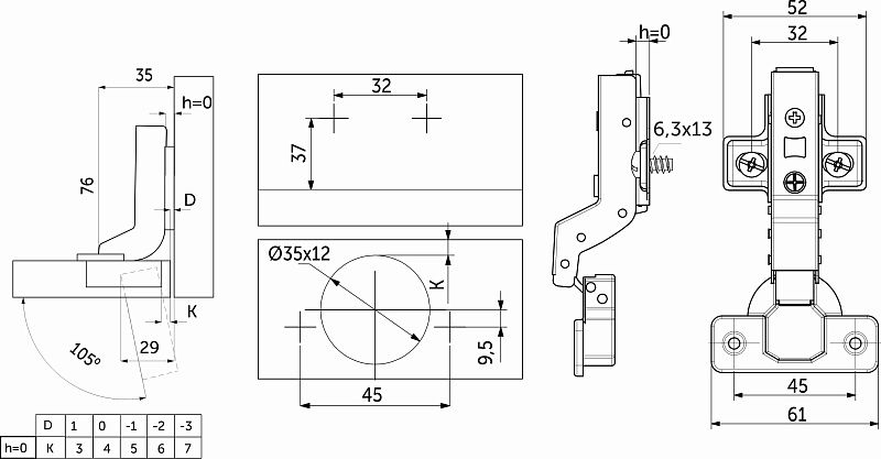 Петля внутренняя с доводчиком 45мм h0 clip-on, еврошурупы, заглушки, упак. = 2 шт., PRIME by AKS 113405, описание: