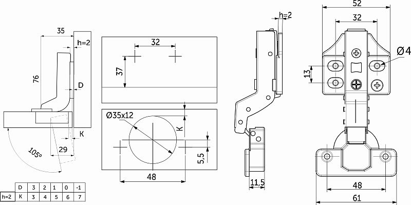 Петля накладная c доводчиком PRIME by AKS 3D — это сочетание надежности, функциональности и эстетики. Созданы в соответствии с международными стандартами для производителей качественной мебели сегмента «средний+». Изготовлены из высококачественной холоднокатанной стали, имеют никелевое покрытие и усиленную пружину, что обеспечивает их надёжность и долговечность. Эти петли идеально подходят для создания стильной и долговечной мебели, отвечающей международным стандартам, а также гарантируют бесперебойную работу механизма на протяжении 100 000 циклов открывания/закрывания, что подтверждается проверкой в собственной испытательной лаборатории. Особая конструкция механизма доводчика гарантирует бесшумное закрытие фасадов, срабатывая при его открытии на угол от 5°. Петли PRIME by AKS имеют эксцентриковую регулировку по глубине, систему двухпозиционного отрывания TWO-WAY, а также прочную систему быстрого монтажа и демонтажа ответной планки CLIP-ON. ДаннаяПетля подходит для фасадов толщиной до 22мм, имеет межцентровое расстояние между отверстиями в чашке в 48мм, а также высоту монтажной планки h2.Петля PRIME by AKS имеет двухслойное гальваническое покрытие (с медным подслоем), что обеспечивает надежную защиту от коррозии. Протестирована в солевом тумане более чем 48 часов без каких-либо коррозионных изменений. Вся линейка петель имеет индивидуальную упаковку по 2 шт. В комплект входят:Петля, монтажная планка, декоративные заглушки чашки и плеча петли, а также саморезы 4*16мм. Наличие широкого диапазона регулировки по горизонтали, глубине и вертикали в ±2мм, позволит минимизировать все неточности монтажа.Петля с доводчиком PRIME by AKS может быть установлена со специальным ограничителем угла открывания до 86° (код 116236). Это поможет избежать столкновений фасада со стеной или с соседними модулями. Внимание: для корректного выставления необходимых зазоров обратите внимание на таблицы наложений фасада на корпус ящика!Технические характеристики: