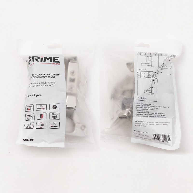 Петля внутренняя с доводчиком 48мм h2 clip-on 3D, саморезы, заглушки, упак 2 шт., PRIME by AKS 112652