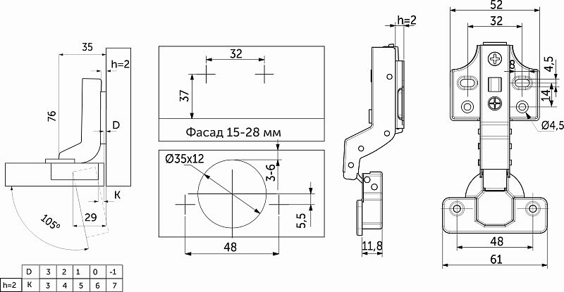 Петля внутренняя c доводчиком PRIME by AKS для фасадов толщиной до 28 мм — это сочетание надежности, функциональности и эстетики. Созданы в соответствии с международными стандартами для производителей качественной мебели сегмента «средний+». Изготовлены из высококачественной холоднокатанной стали, имеют никелевое покрытие и усиленную пружину, что обеспечивает их надёжность и долговечность. Эти петли идеально подходят для создания стильной и долговечной мебели, отвечающей международным стандартам, а также гарантируют бесперебойную работу механизма на протяжении 100 000 циклов открывания/закрывания, что подтверждается проверкой в собственной испытательной лаборатории. Особая конструкция механизма доводчика гарантирует бесшумное закрытие фасадов, срабатывая при его открытии на угол от 5°. Петли PRIME by AKS имеют эксцентриковую регулировку по глубине, систему двухпозиционного отрывания TWO-WAY, а также прочную систему быстрого монтажа и демонтажа ответной планки CLIP-ON. ДаннаяПетля подходит для фасадов толщиной от 15 до 28 мм, имеет межцентровое расстояние между отверстиями в чашке в 48мм, а также монтажную планку на четыре отверстия высотой h2 для более надежного крепления петли к корпусу мебели.Петля PRIME by AKS имеет двухслойное гальваническое покрытие (с медным подслоем), что обеспечивает надежную защиту от коррозии. Протестирована в солевом тумане более чем 48 часов без каких-либо коррозионных изменений. Вся линейка петель имеет индивидуальную упаковку по 2 шт. В комплект входят:Петля, монтажная планка, декоративные заглушки чашки и плеча петли, а также саморезы 4*16мм. Наличие широкого диапазона регулировки по горизонтали, глубине и вертикали в ±2мм, позволит минимизировать все неточности монтажа.Петля с доводчиком PRIME by AKS может быть установлена со специальным ограничителем угла открывания до 86° (код 116 236). Это поможет избежать столкновений фасада со стеной или с соседними модулями. Внимание: для корректного выставления необходимых зазоров обратите внимание на таблицы наложений фасада на корпус ящика!Технические характеристики: