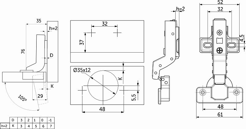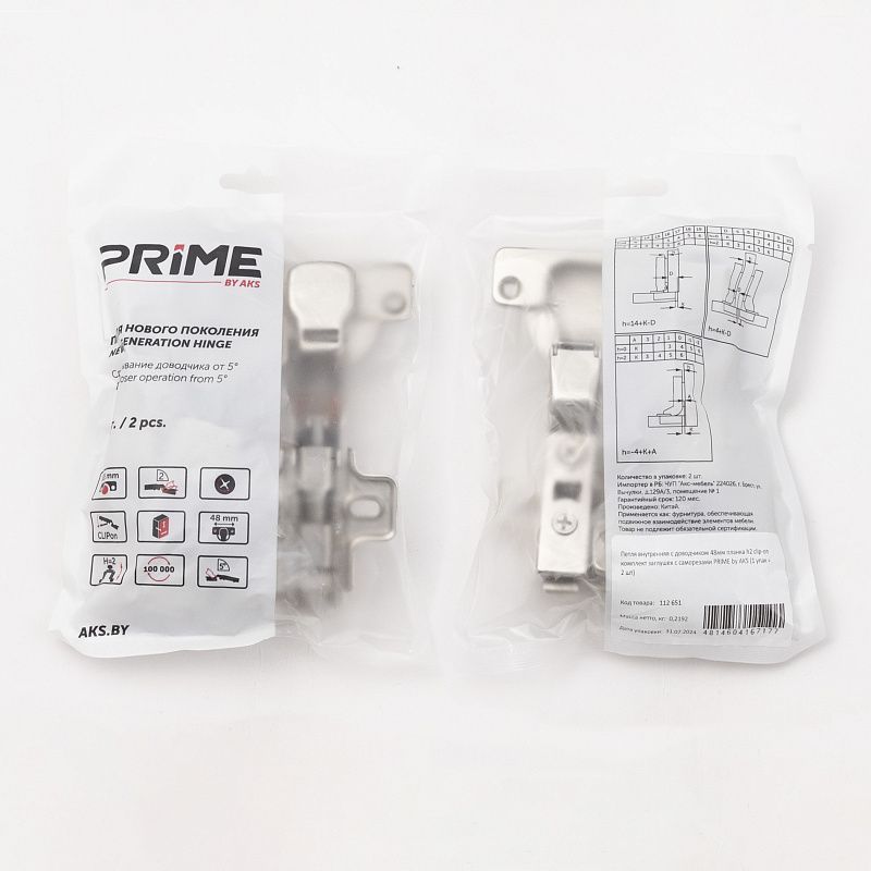 Петля внутренняя с доводчиком 48мм h2 clip-on, саморезы, заглушки, упак. = 2 шт., PRIME by AKS 112651, описание:
