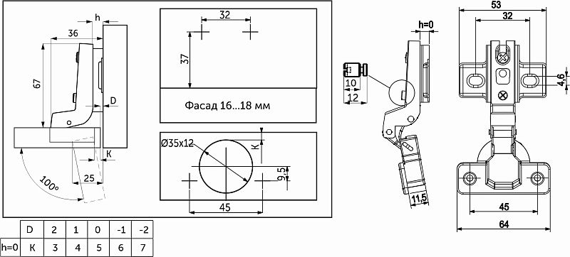Петля накладная с пружиной GRIDLI – облегченная мебельнаяПетля без доводчика, с углом установки 90°. Изготовлена из холоднокатанной стали. Диаметр чашки петли составляет ∅35 мм. Глубина чашки 11,5 мм. Глубина сверления, необходимая для установки, 12 мм. Для простоты монтажа и регулировки даннаяПетля оснащена механизмом надвижного монтажа slide-on. Регулировка по глубине -винтовая.Петля предназначена для фасадов толщиной от 15 до 22 мм, имеет межцентровое расстояние между отверстиями в чашке в 45мм, а также высоту монтажной планки h0. Петли данной линейки являются двухходовыми, с возможностью остановки фасада в полуоткрытом положении, имеют угол открывания в 100°. Вес петли 52±1гр.Технические характеристики: