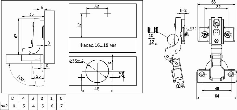 Петля накладная с пружиной AKS с еврошурупами – классическая мебельнаяПетля без доводчика, с углом установки 90°. Изготовлена из холоднокатанной стали. Диаметр чашки петли составляет ∅35 мм. Глубина чашки 11,5 мм. Глубина сверления, необходимая для установки, 12 мм. Для простоты монтажа и регулировки даннаяПетля оснащена механизмом надвижного монтажа slide-on и регулировочным винтом с резьбой 10 мм. Регулировка по глубине -винтовая.Петля предназначена для фасадов толщиной от 15 до 22 мм, имеет межцентровое расстояние между отверстиями в чашке в 45мм, а также высоту монтажной планки h0. Петли данной линейки являются двухходовыми, с возможностью остановки фасада в полуоткрытом положении, имеют угол открывания в 100°. Для монтажа планки в комплект входят предустановленные еврошурупы 6,3*13мм. Вес петли 55±1гр. Прочность, долговечность и надежность в использовании подтверждается 40 000 циклами открывания и закрывания.Технические характеристики: