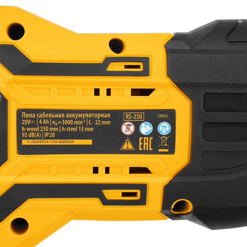 Пила сабельная аккумуляторная бесщет. RS-250, Li-Ion, 20 В Denzel 28802, описание: