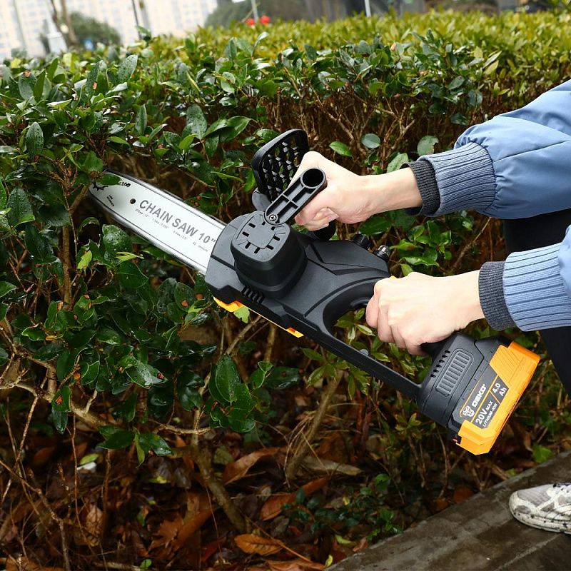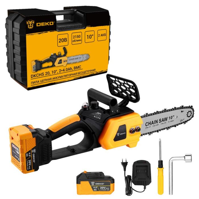 - Пила цепная аккумуляторная бесщеточная в кейсе DEKO DKCHS 20, 10", 20В, 2x4.0Ач, з/у применяется при работе в мастерской или в саду для распиливания различных материалов.