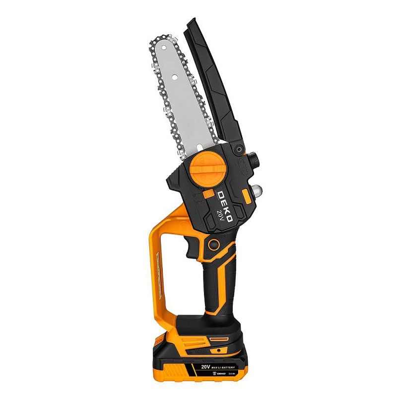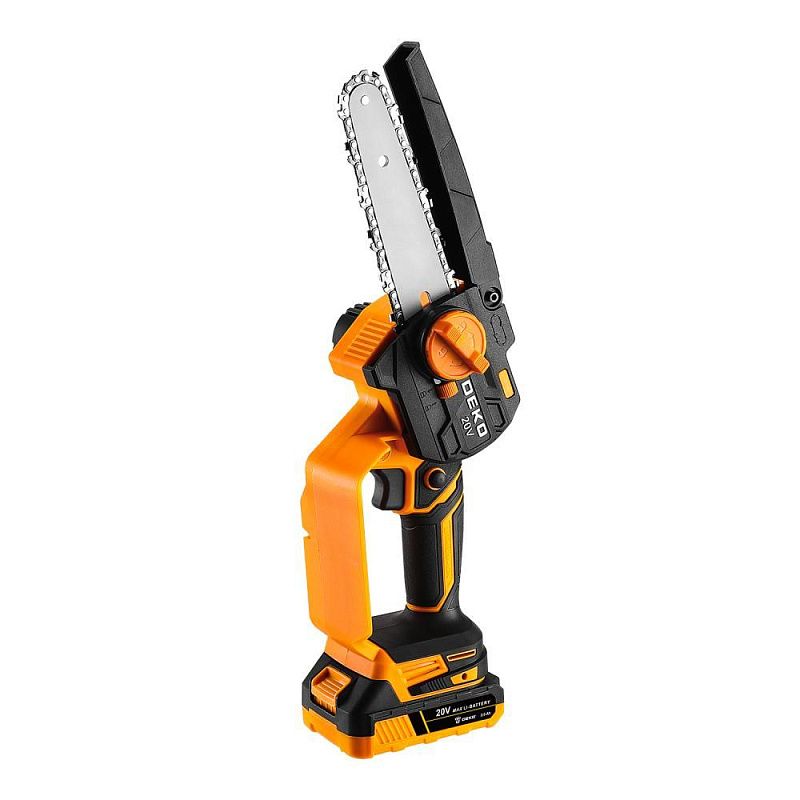 - Пила цепная аккумуляторная DEKO DKCHS 20-6, 20В, 1x2.0Ач, 2 цепи незаменима при работе в мастерской или в саду для распиливания различных материалов.