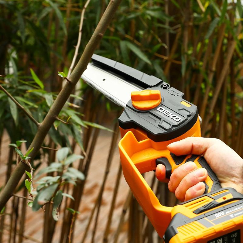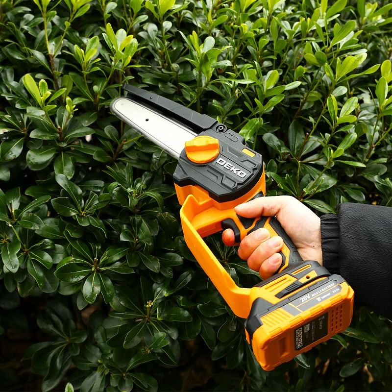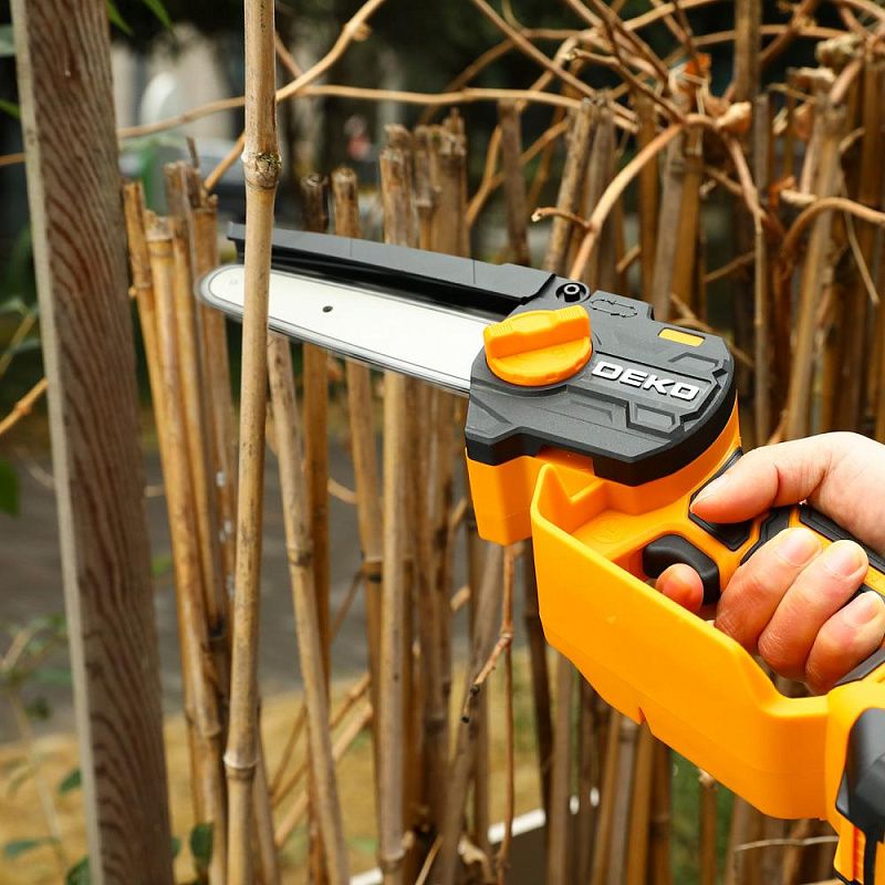 - Пила цепная аккумуляторная DEKO DKCHS 20-6 незаменима при работе в мастерской или в саду для распиливания различных материалов.