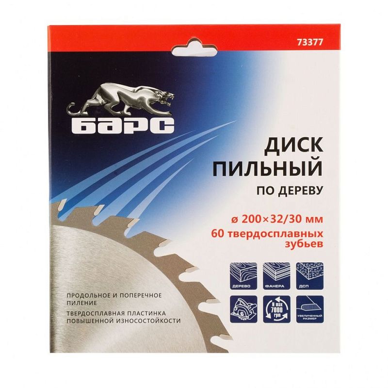 Пильный диск по дереву 200 x 32/30 мм, 60 твердосплавных зубъев Барс 73377, описание: