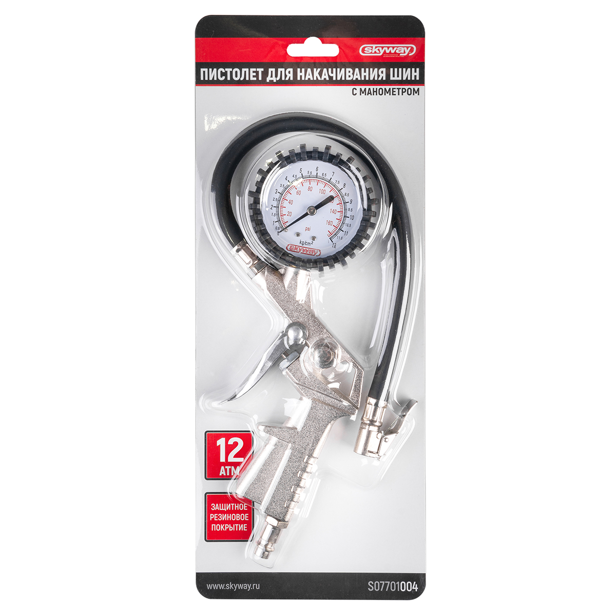 Пистолет для накачивания шин SKYWAY с манометром 12 АТМ быстросъемное соединение - пистолет со встроенным манометром используется для накачки и регулировки давления в автомобильных шинах. Металлический прочный корпус и защитный резиновый чехол манометра улучшают устойчивость к повреждениям, обеспечивая его целостность при падении или в процессе использования. Патрон изготовлен из легкого цинкового сплава, поверхность пистолета обработана чпециальным покрытием, которое защищает от коррозии и окисления. Гибкий рзиновый шланг облегчает применение, позволяя работать в труднодоступных местах.