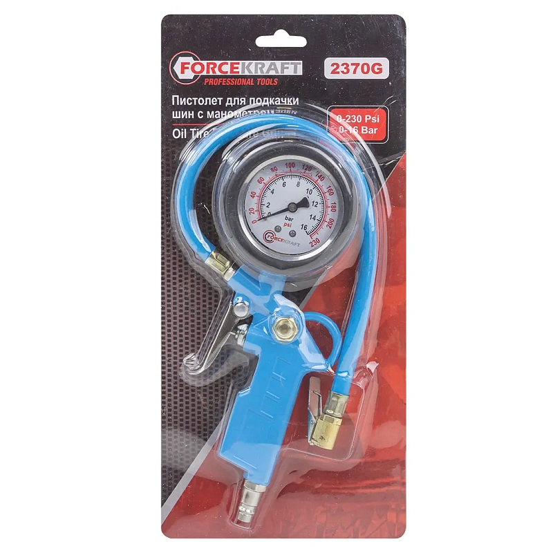Пистолет для подкачки шин с аналоговым манометром и шлангом, 0-16bar, манометр заполнен глицирином ForceKraft FK-2370G, описание и характеристики: