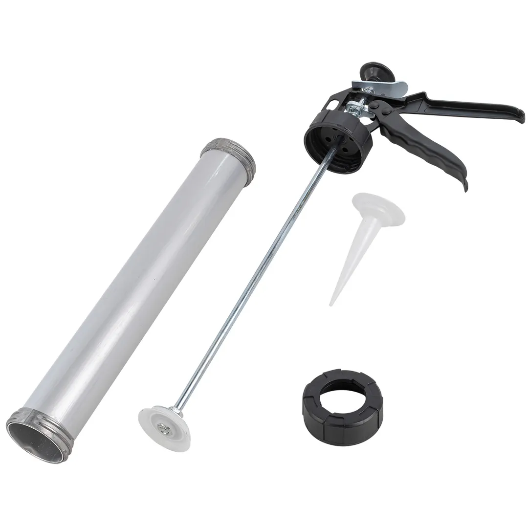 Строительный пистолет для герметика – это удобный инструмент для равномерного, точного выдавливания состава из пластиковой, картонной или фольгированной упаковки. Он облегчает работу по герметизации – не надо прикладывать больших усилий, чтобы извлечь необходимое количество массы, с ним увеличивается скорость процесса. Комплектация: Пистолет для силикона; Алюминиевая туба для пистолета длина 380 мм, диаметр 50 мм, объём 590мл; пластиковое кольцо для наконечника; пластиковый наконечник длина 110 мм.Преимущества работы с нами