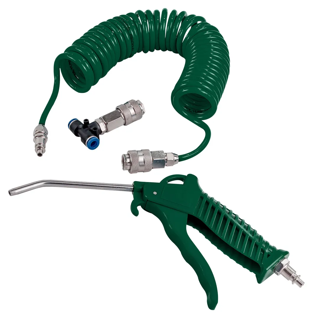 Продувочным (обдувочным) пистолетом называется устройство, которое используется для продува и обдува отверстий, деталей, поверхностей и т.п. сжатым воздухом. Такая процедура требуется для очистки от пыли и грязи или просушки. Конструктивно обдувочный пистолет представляет собой пневматическое приспособление рычажного типа. Поток сжатого воздуха от компрессора, поступая в инструмент, проходит через сопло и подается дозировано. Подача необходимого количества воздуха осуществляется с помощью нажатия на курок.Чаще всего обдувочный пистолет применяется для продува забившихся труб и каналов и других труднодоступных мест. Более востребован в сфере ремонта автомобилей и техники, промышленности и строительстве. Главные преимущества таких пистолетов: компактность, надежность, эффективность, доступная цена и простота применения. Длина сопла 120мм Шланг с фитингами под быстросьем 4х6 мм, длина 5м В комплекте фитинг для пластиковых трубок 6х6мм под быстросьем. (Данные фитинг штуцеры на шланге несовместимы со быстросьемами EURO-стандарта)Преимущества работы с нами