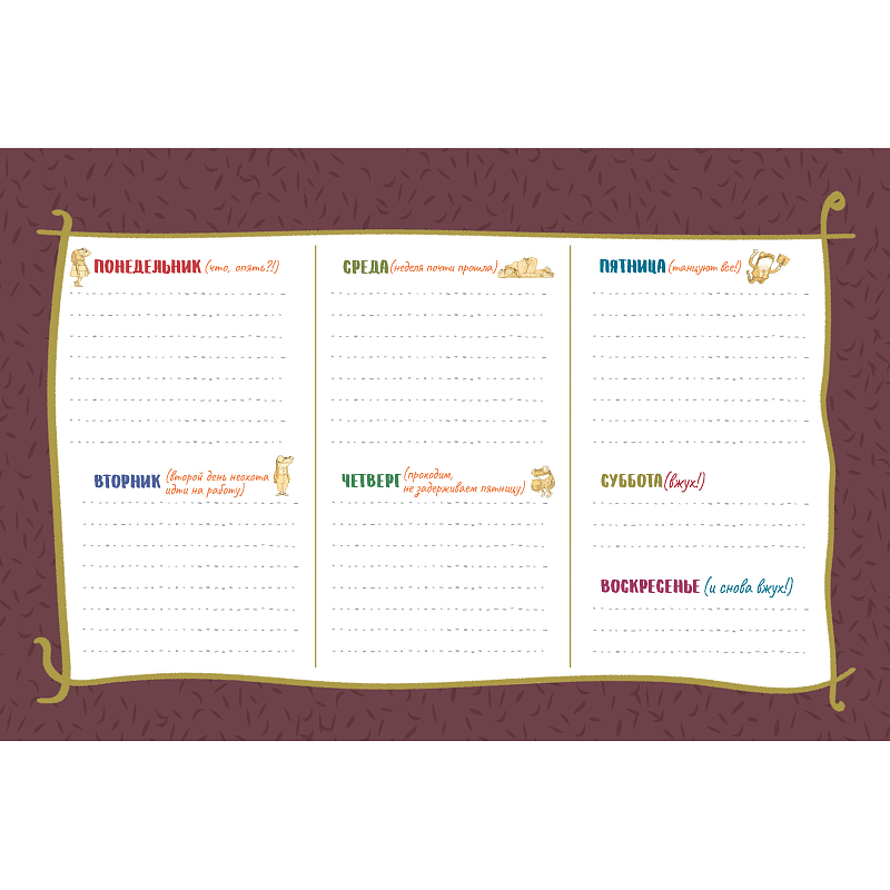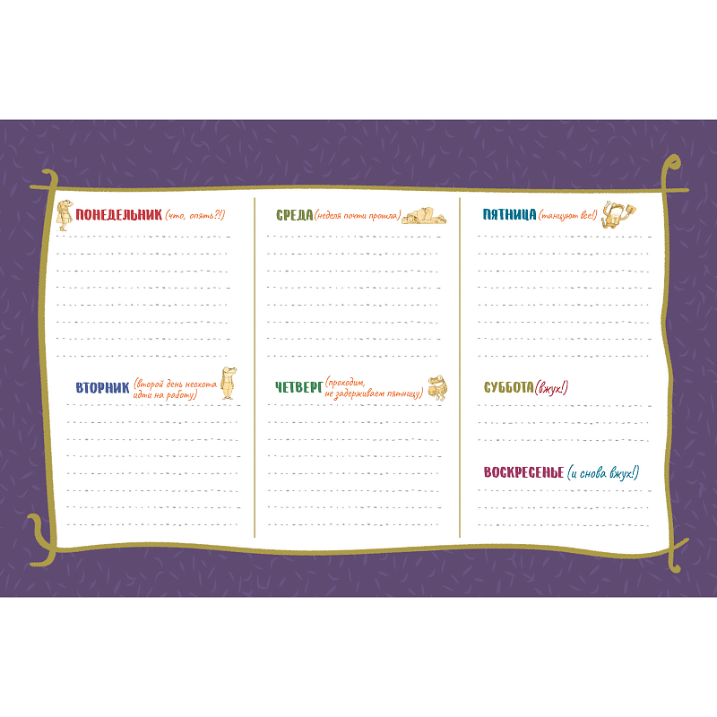Благодаря практичному формату планер можно разместить на любом столе, украсив ваше рабочее место необычным образом. Яркие иллюстрации, стильный дизайн, уникальный персонаж и его саркастичные шутки создадут особое настроение, которое скрасит серые будни, поможет пережить очередную рабочую неделю, ничего не забыть и все успеть!