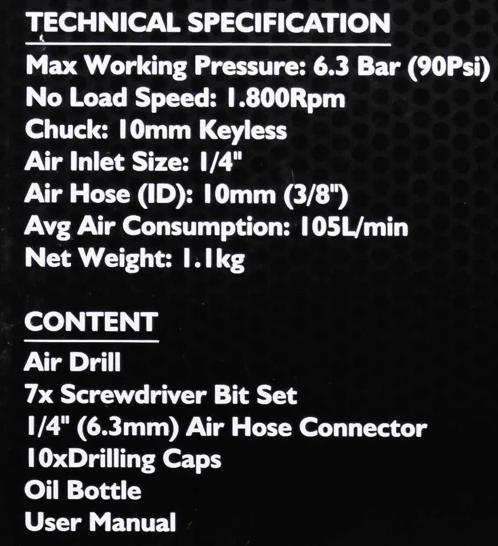 Пневмодрель с реверсом, набором бит и сверел 20 пр. JCB JCB-RP7810, описание и характеристики: