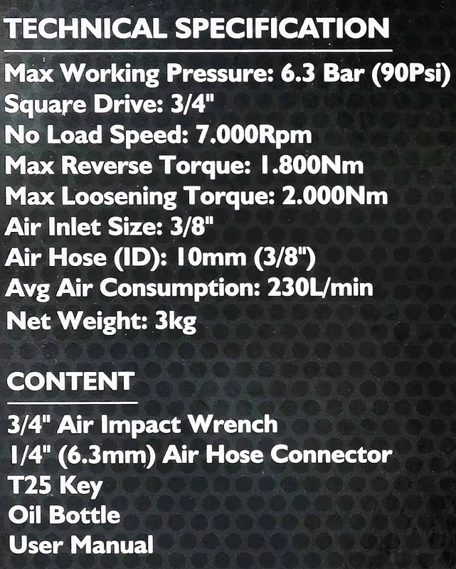 Пневматический гайковерт предназначен для использования в сборочных цехах предприятий и на станциях технического обслуживания автомобилей, а также может с успехом применяться в условиях домашней автомастерской. Технические характеристики: посадочный квадрат 3/4", резьба под воздух 3/8", минимальный диаметр шланга 12мм максимальный крутящий момент - 1800 Нм, максимальное число оборотов - 7000 об/мин, давление - 6.3 бар, расход воздуха - 230 л/мин. Пневмогайковерт ударный "Twin Hammer"облегчает и ускоряет операции, связанные со сборкой и разборкой различного вида резьбовых соединений в процессе монтажных и демонтажных работ. Облегченный корпус инструмента позволяет применять его в условиях ограниченного рабочего пространства, а прорезиненная профильная рукоятка гарантирует комфорт при работе с инструментом. В комплекте также поставляются штуцер "елочка"12мм с внешней резьбой 3/8", ключ Г-образный TORX T25, масленка для смазывания механизмов гайковерта.Преимущества работы с нами