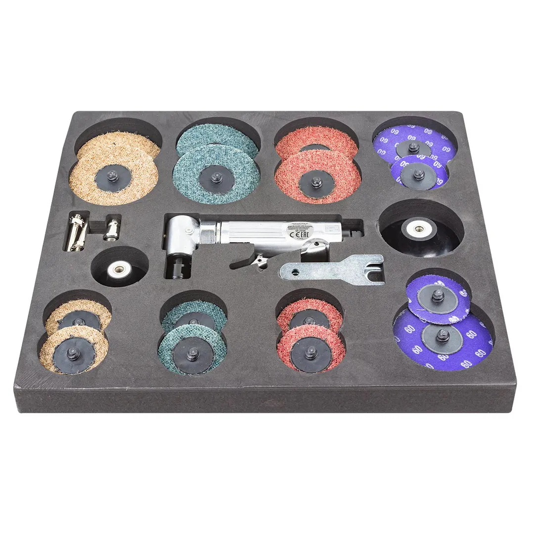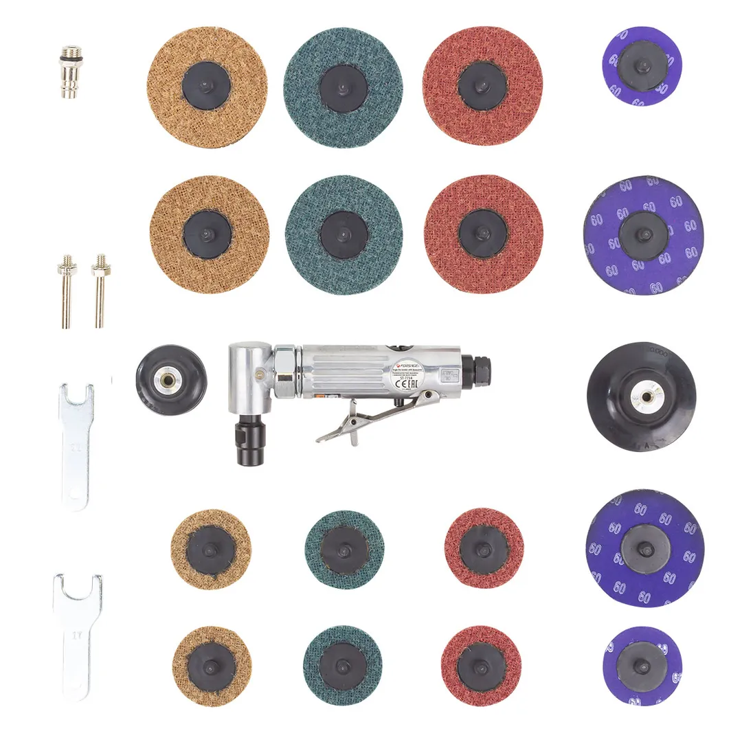 Пневмозачистная машинка с комплектом аксессуаров предназначенная для выполнения зачистных и шлифовальных работ, как при строительстве, так и в автомобильном ремонте. Головка с углом наклона 90° обеспечивает гибкость в труднодоступных местах. Это очень компактный и легкий инструмент, обеспечивающий исключительную маневренность при высокоскоростном шлифовании. Основные характеристики: Скорость холостого хода: 20000 об/мин; Расход воздуха: 113 л/мин; Цанга: 6.0 мм; Давление воздуха: 90psi/6.2 бар. В комплект входит: Пневмозачистная машинка 90°(ST-7733) Круги полировальные с креплением Roloc 2" - 6 шт. Круги полировальные с креплением Roloc 3" - 6 шт. Круги шлифовальные с креплением Roloc (цирконат алюминия и оксид алюминия) 2" - 2 шт. Круги шлифовальные с креплением Roloc (цирконат алюминия и оксид алюминия) 3" - 2 шт. Подложки резиновые с держателем для крепления Roloc : 2",3" . Ключи для регулировки машинки 11 и 17мм - 2 шт. Штуцер для быстроразьема с внешней резьбой 1/4" - 1 шт.Преимущества работы с нами