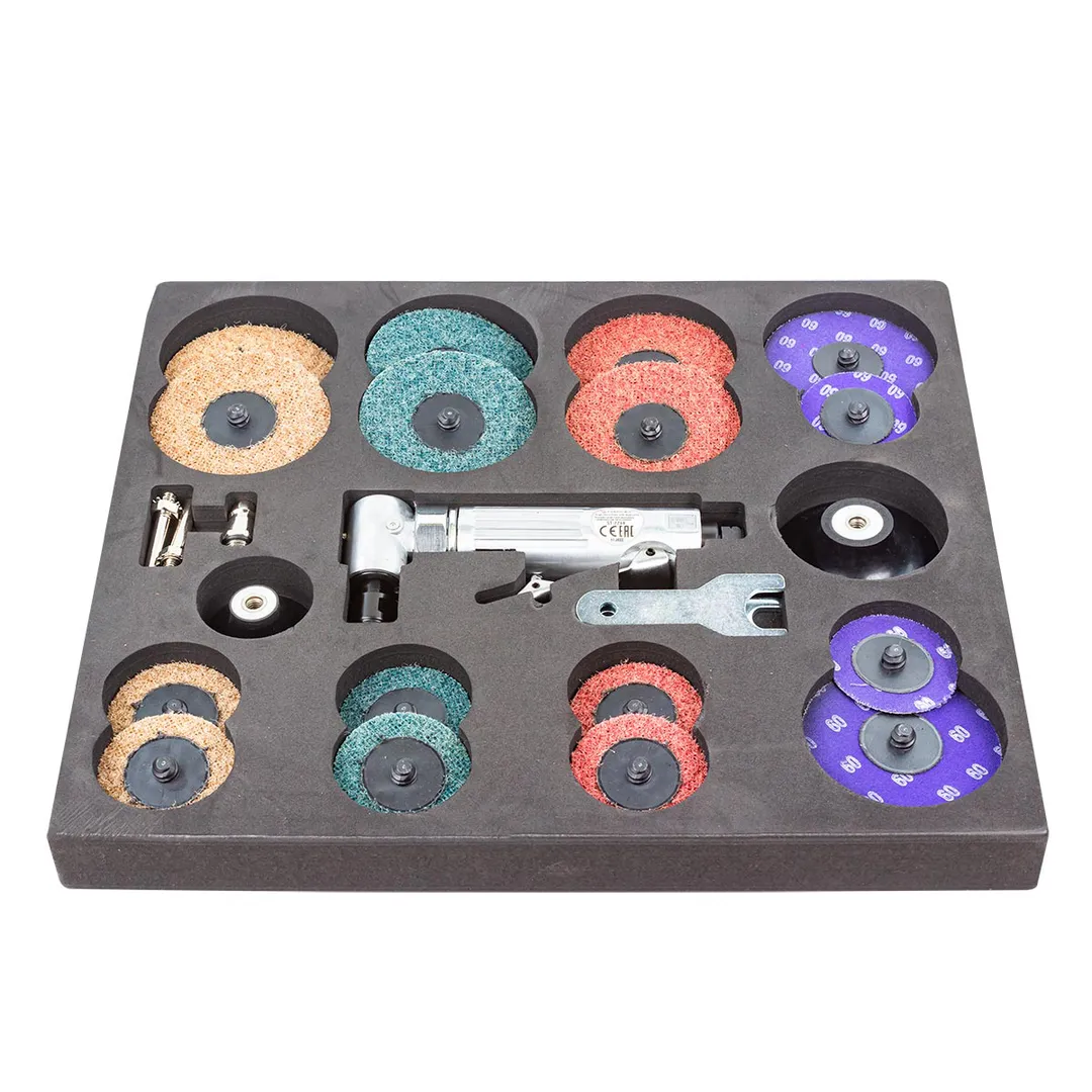 Пневмозачистная машинка с комплектом аксессуаров предназначенная для выполнения зачистных и шлифовальных работ, как при строительстве, так и в автомобильном ремонте. Головка с углом наклона 90° обеспечивает гибкость в труднодоступных местах. Это очень компактный и легкий инструмент, обеспечивающий исключительную маневренность при высокоскоростном шлифовании. Основные характеристики: Скорость холостого хода: 20000 об/мин; Расход воздуха: 113 л/мин; Цанга: 6.0 мм; Давление воздуха: 90psi/6.2 бар. В комплект входит: Пневмозачистная машинка 90°(ST-7733) Круги полировальные с креплением Roloc 2" - 6 шт. Круги полировальные с креплением Roloc 3" - 6 шт. Круги шлифовальные с креплением Roloc (цирконат алюминия и оксид алюминия) 2" - 2 шт. Круги шлифовальные с креплением Roloc (цирконат алюминия и оксид алюминия) 3" - 2 шт. Подложки резиновые с держателем для крепления Roloc : 2",3" . Ключи для регулировки машинки 11 и 17мм - 2 шт. Штуцер для быстроразьема с внешней резьбой 1/4" - 1 шт.Преимущества работы с нами