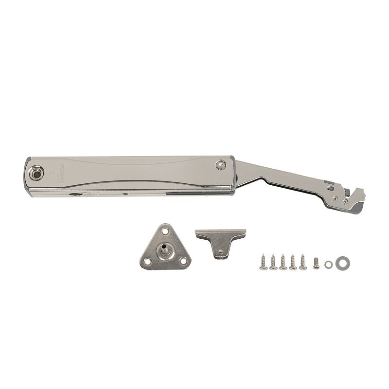 Подъемник KRONOS MODERN предназначен для открытия фасадов вверх и его фиксации в открытом положении. Он идеально подходит для сборки небольших тумб и верхних шкафов кухни, обеспечивая как удобный доступ к их содержимому, так и безопасное использование. Подъемный механизм в стальном корпусе и с усовершенствованной конструкцией в зависимости от веса фасада может устанавливаться как с одной, так и с двух сторон ящика. Минимальная высота ящика 220 мм. Минимальная глубина ящика 150 мм. Фиксация в любом положении при открытии фасада от 30°. Усилие подъемника можно регулировать, поворачивая внутренний винт. Для корректной работы подъемного механизма рекомендуется установка совместно сПетлями с доводчиком. При этом петли с доводчиком обеспечат мягкое и бесшумное закрывание. Угол открывания двери зависит и ограничен углом открывания петли, используемой при установке. Петли и амортизаторы, используемые совместно с подъемником, приобретаются отдельно. Цвет механизма: никель. В комплект входит: подъемник - 1 шт, крепление фасада - 1 шт, крепление корпуса - 1 шт, шайба - 2 шт, саморезы 3,5*16 - 5 шт, винт М4*10 - 1 шт, шаблон, инструкция. Мощностьh (heavy). Коэффициент мощности LF=1500-2240. В зависимости от материала и веса фасада подходящую мощность подъемника можно определить с помощьюТехнические характеристики: