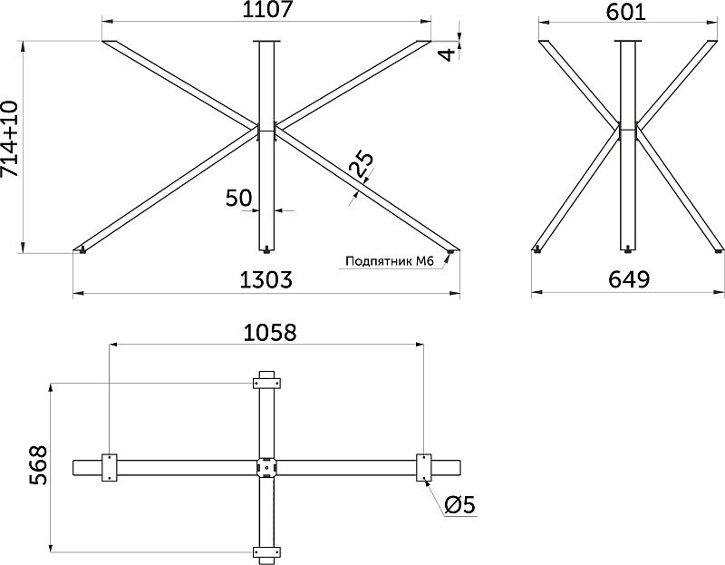 Подстолье изготовлено из металлического профиля 50*25мм. Профиль изготовлен из холоднокатанной стали. Толщина профиля 1,5мм. Толщина площадки 4мм. Покрытие - полимерное порошковой краской, черный муар. Рекомендуемая статическая нагрузка на 1 комплект - до 100 кг. Рекомендуемые размеры столешниц: ширина 1350-1550мм, глубина 650-750мм. Комплектация подстолья: опора мебельная - 4 шт. , подпятник регулируемоый (может быть уже вкручен в опоры) - 4 шт. , соединительная планка 65*65*4мм - 2 шт. , болт М8*80 - 1 шт. , гайка М8 - 1 шт.Технические характеристики: