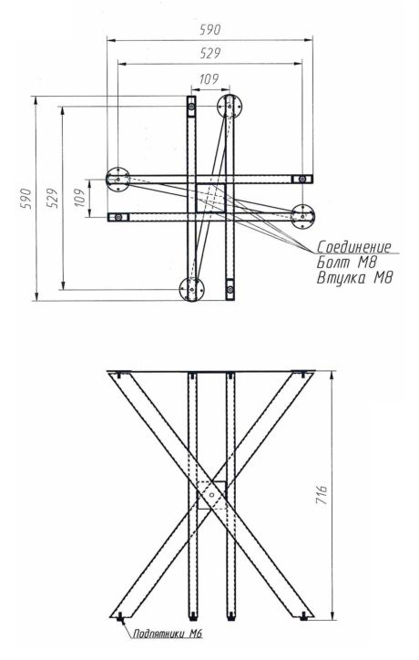 Подстолье изготовлено из металлического профиля 50*25мм. Профиль изготовлен из холоднокатанной стали. Толщина профиля 1,5 мм. Толщина площадки-шайбы - 2 мм. Покрытие - полимерное порошковой краской, белый муар. Рекомендуемая статическая нагрузка на 1 комплект - до 80 кг. Рекомендуемые размеры столешниц: диаметр от 700 до 900мм. Комплектация подстолья: опора - 4 шт. , подпятник М6 - 4 шт. , царга - 2 шт. , площадка - 4 шт. , узел крепления - 1 компл. , соединение царги - 1 компл.Технические характеристики: