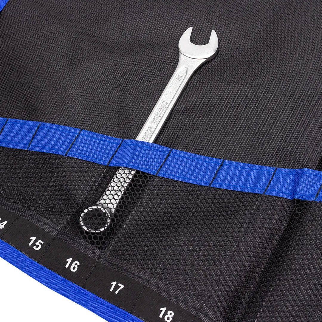 Органайзер для гаечных ключей – это хорошо продуманный аксессуар для хранения инструментов, который изготавливается для комфортного и долговечного пользования. Полотно (держатель) на 14 ключей гаечных. Чехол в развернутом виде имеет размеры 630 мм на 470 мм. Полотно-чехол для комбинированных, рожковых или накидных ключей имеет специальные отверстия с металлической оправой - они позволяют сэкономить место в гараже или мастерской, повесив набор гаечных ключей на стену или специальный стенд. Чехол-полотно для набора ключей гаечных имеет специальную фиксирующую ленту на застежке: набор комбинированных ключей можно скрутить и зафиксировать лентой.Преимущества работы с нами