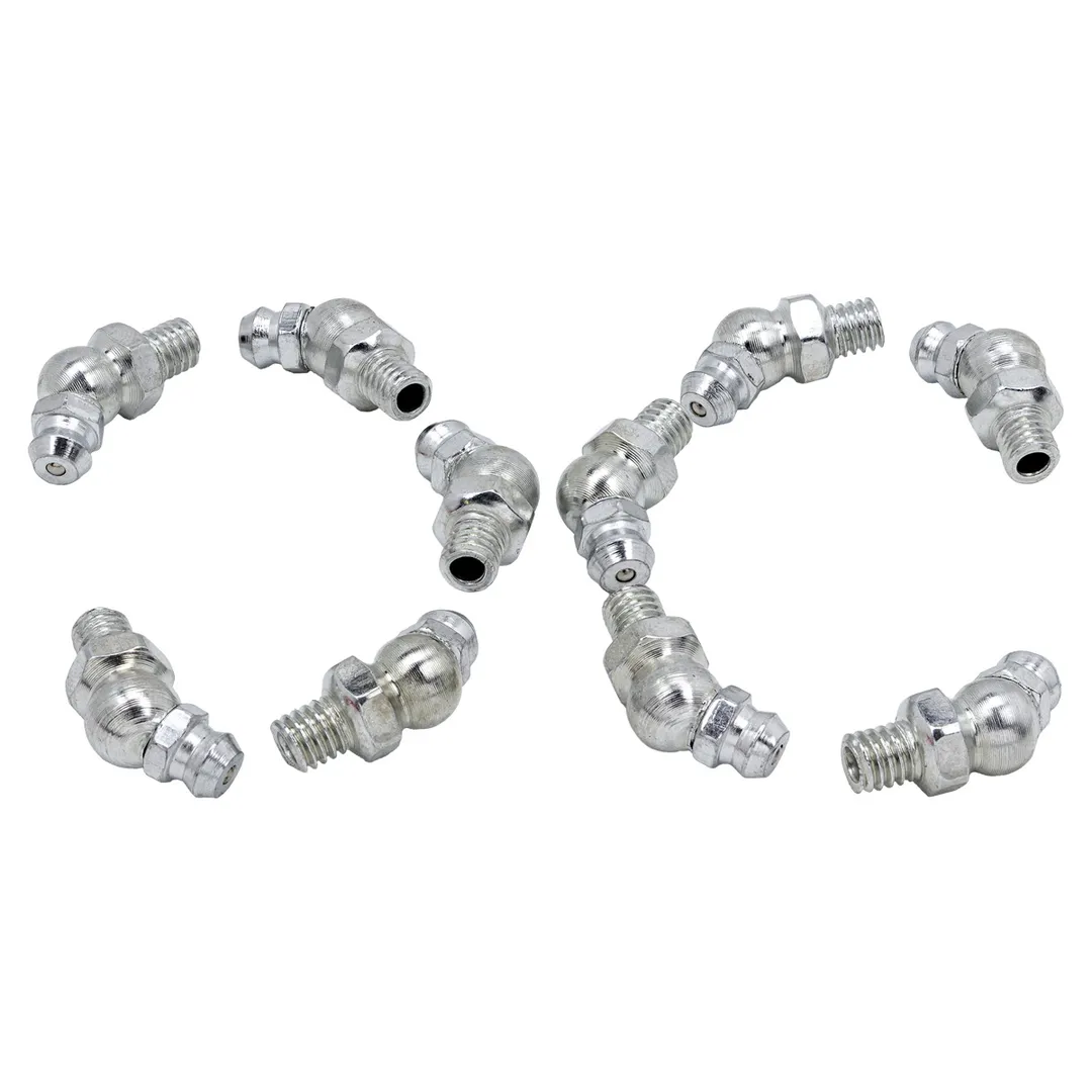 Набор из 10 пресс-масленок угловых — это универсальное приспособление, предназначенное для быстрого и эффективного выполнения смазки узлов различной техники. Работает пресс-масленка как обратный клапан: внутри ее металлического корпуса имеется специальный стальной шарик, который поджимается там при помощи пружины. Поставляется в комплекте из 10 шт. Угол наклона 45 градусов, размер каждой - 6 мм.Преимущества работы с нами