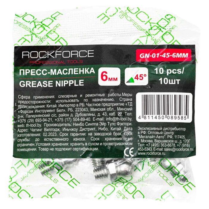 Пресс-масленка 6 мм угловая 45°, комплект 10 шт. RockForce RF-GN-01-45-6MM