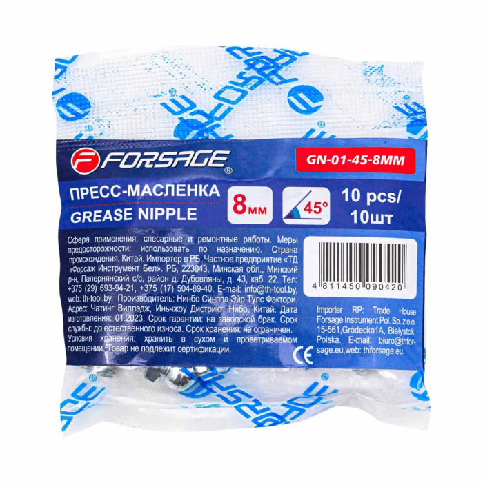 Пресс-масленка 8 мм угловая, 45 град., 10 шт Forsage F-GN-01-45-8MM