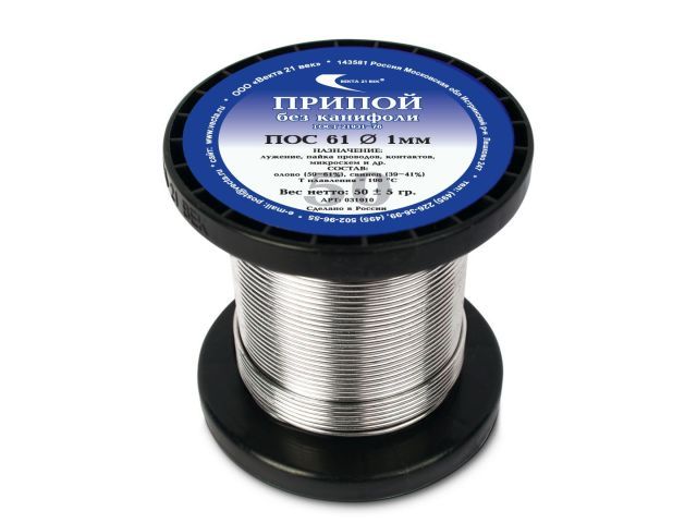 Припой ПОС 61 проволока, катушка ф1мм, 50г, без канифоли Векта 31910