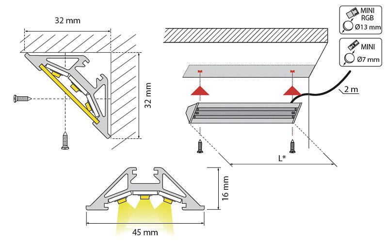 Профиль расчитан на установку трех лент под разными углами к экрану: под прямым углом и под углами примерно 30 и 120 градусовТехнические характеристики: