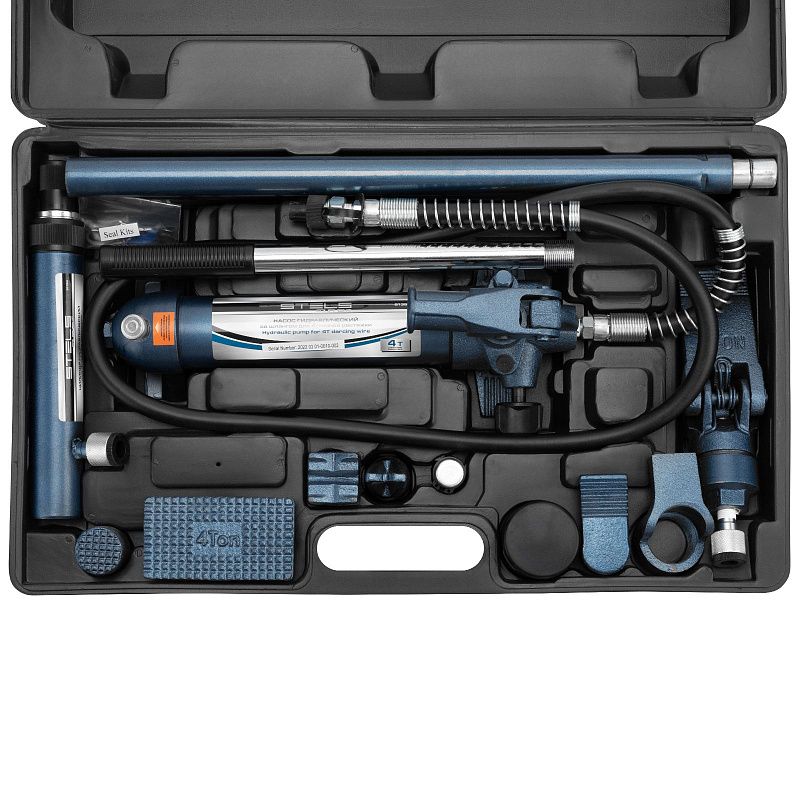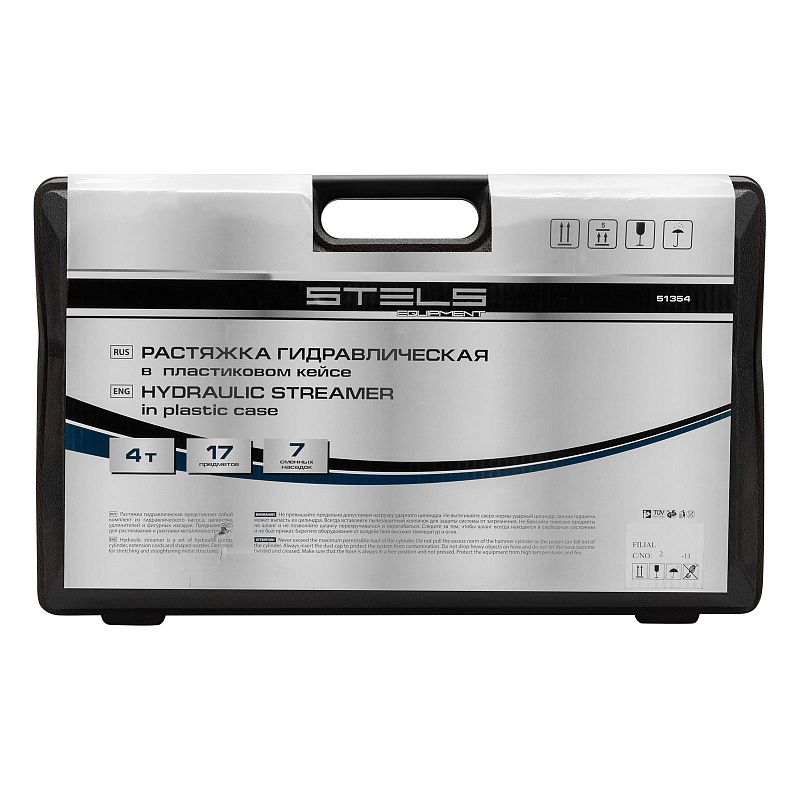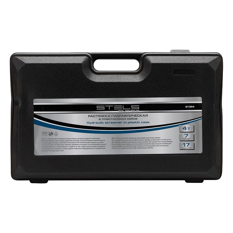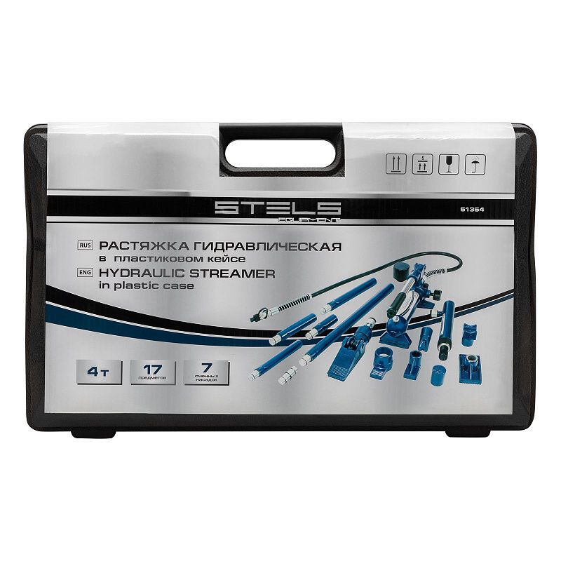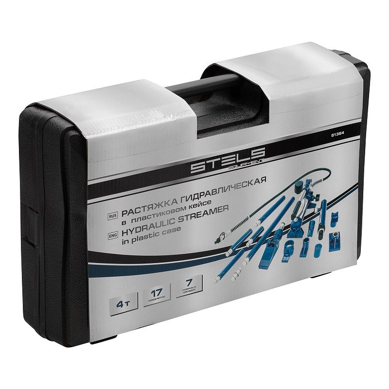 Растяжка гидравлическая, 4 т, набор из 17 предметов, 7 сменных насадок, в пластиковом кейсе Stels 51354, описание: