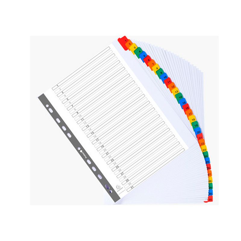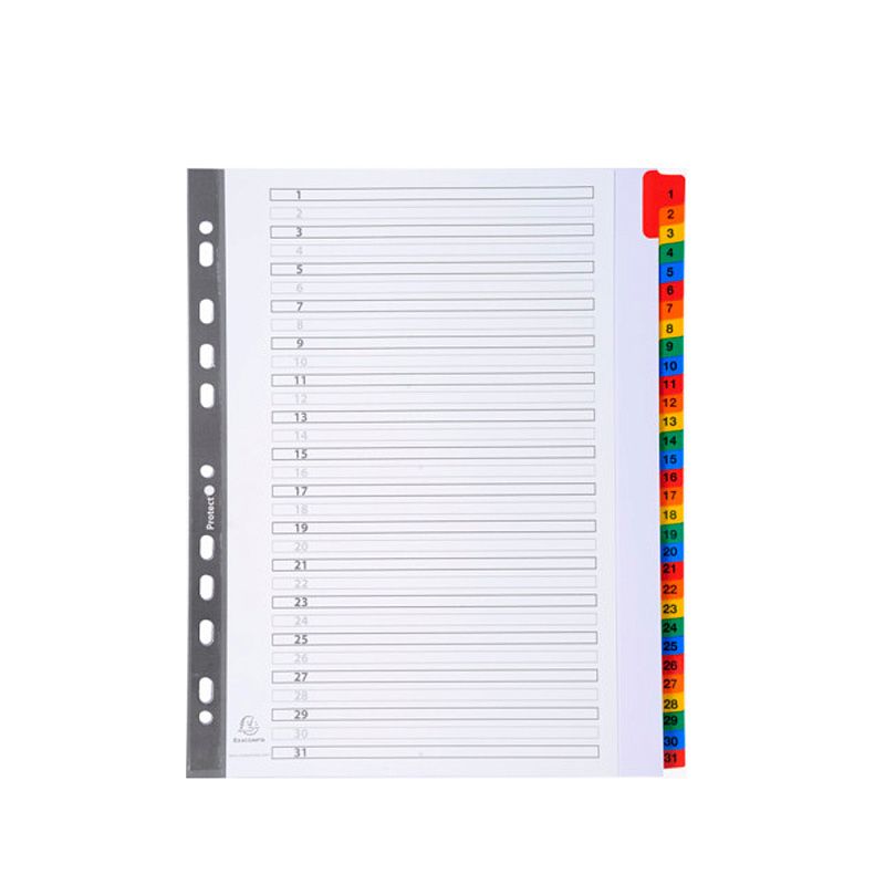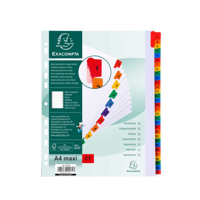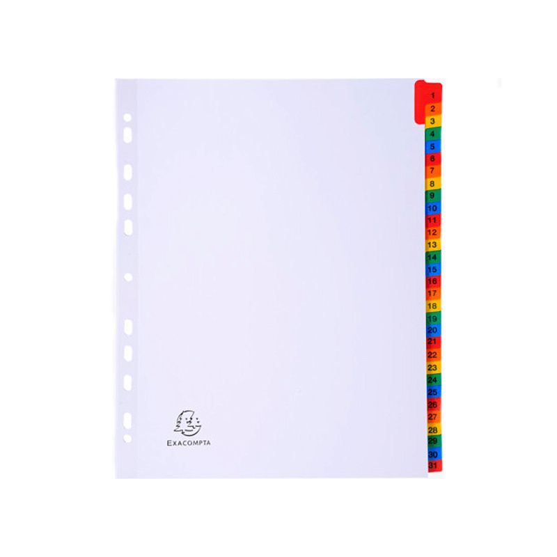 Разделитель на 31 деление Exacompta. Изготовлен из белого картона, плотностью 160 г/м2 с цветными пластиковыми элементами. Имеется числовая маркировка и информационно маркерная карта.